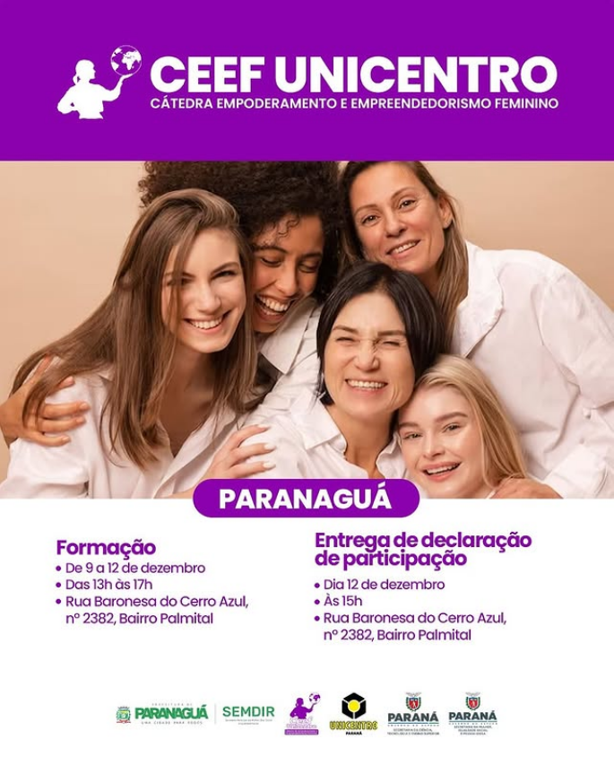 A Prefeitura de Paranaguá, através da SEMDIR, convida as mulheres da nossa cidade para a Formação da Cátedra de Empoderamento e Empreendedorismo Feminino – CEEF UNICENTRO, que acontecerá de 9 a 12 de dezembro.